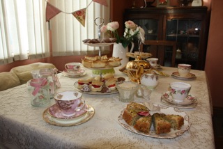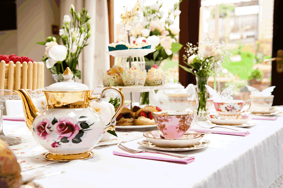 - Cake stands, tea pot, cups and saucers, plates, bowls, milk